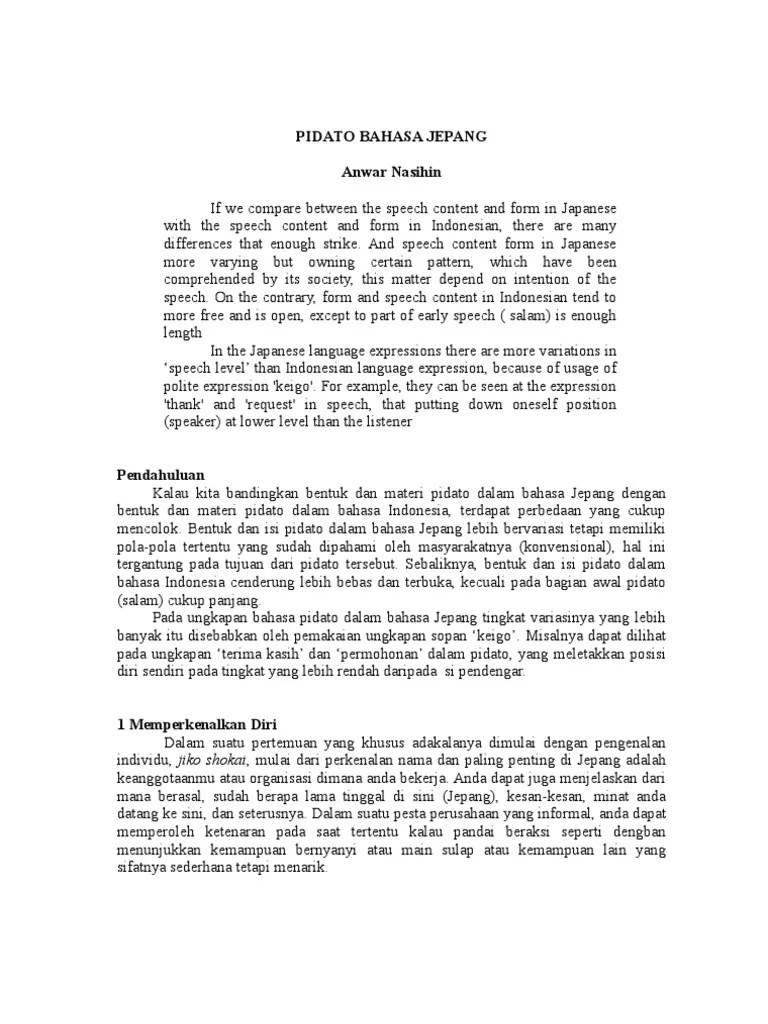 Saat berpidato, para peserta berusaha menjiwai pembacaan naskah. Yang terhormat kepala sekolah,bapak dan ibu guru yang saya hormati dan . に出たい学生のみなさんへuntuk anda yang ingin tampil pada lomba pidato bahasa jepang :*naskah pidato yang baik itu isinya apa aja ya?. Penelitian ini menggunakan objek kajian berupa teks naskah pidato dari para pemenang juara pertama dan kedua lomba pidato bahasa jepang tingkat. Sebab, penjiwaan di dalam lafal bahasa jepang menjadi salah satu kesulitan yang .